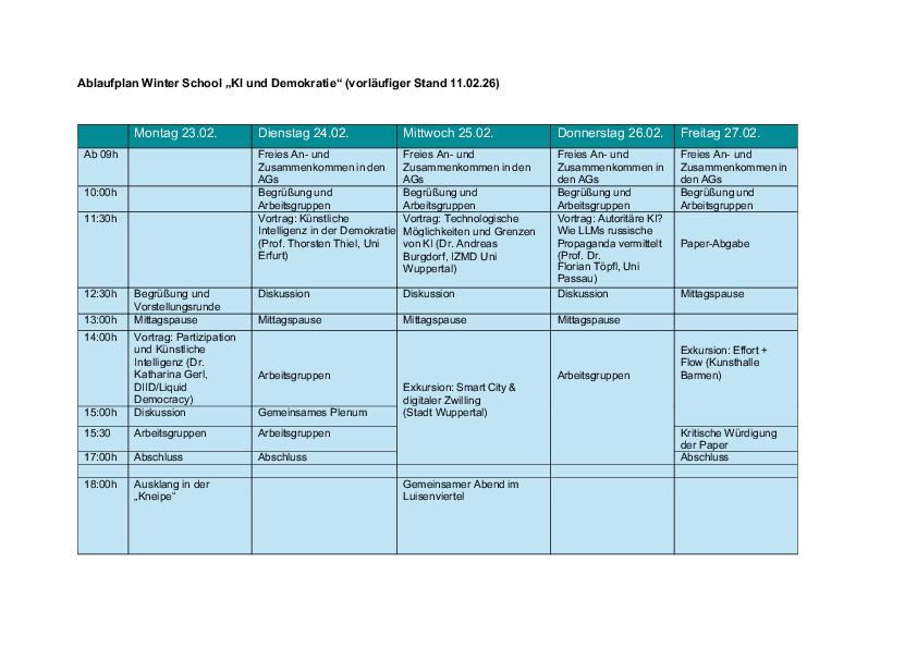 Vor diesem Hintergrund bietet das Institut für Politikwissenschaft der Bergischen Universität ihre zweite Winter School mit dem Titel KI & Demokratie an, die vom 23.02.-27.02.2026 an der Bergischen Universität stattfindet.